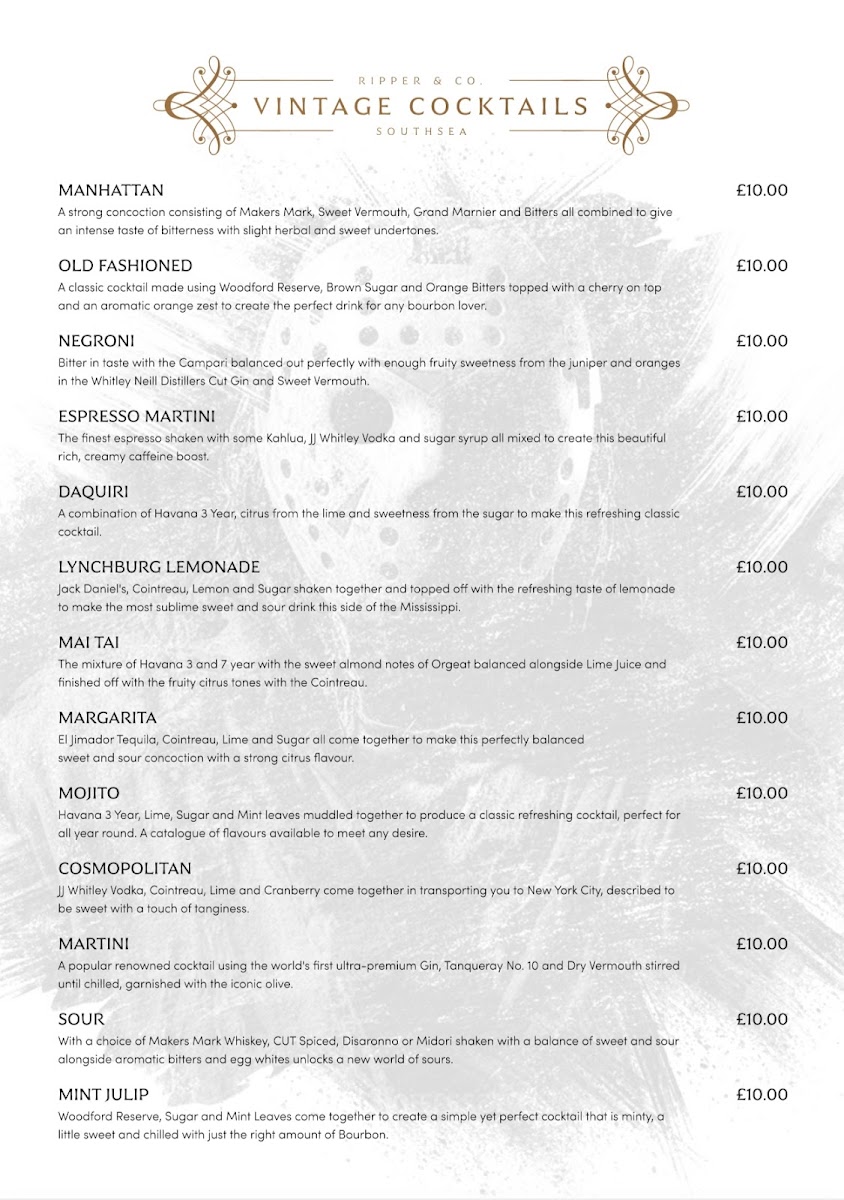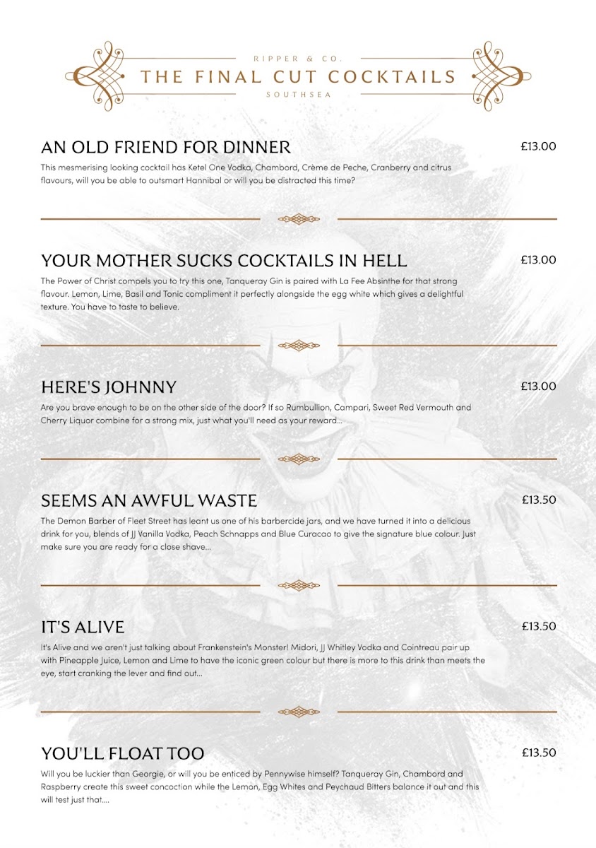 Welcome to Ripper & Co, a unique cocktail bar located at 46 Osborne Rd, Southsea. Here, horror movie enthusiasts and food lovers unite in a thrilling culinary experience. The menu is a delightful mix of innovative cocktails, such as the "Old Friend for Dinner" and "Mist of Manhattan," each inspired by iconic horror films, promising an interactive and memorable evening.
